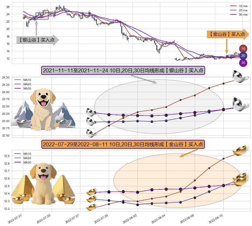 ⚄ 2022-08-01-日至2022-08-11-日显现 10日-20日-30日均线 【金山谷】买入点 其再次确认了买入信号,可靠性更强,买入