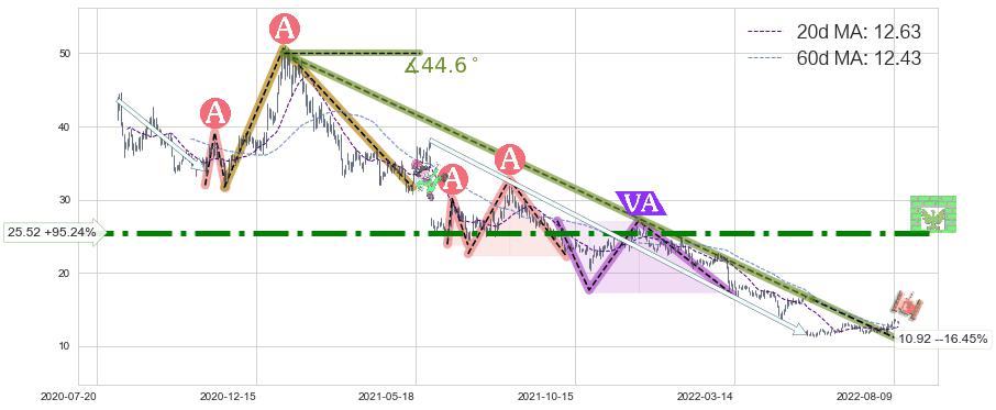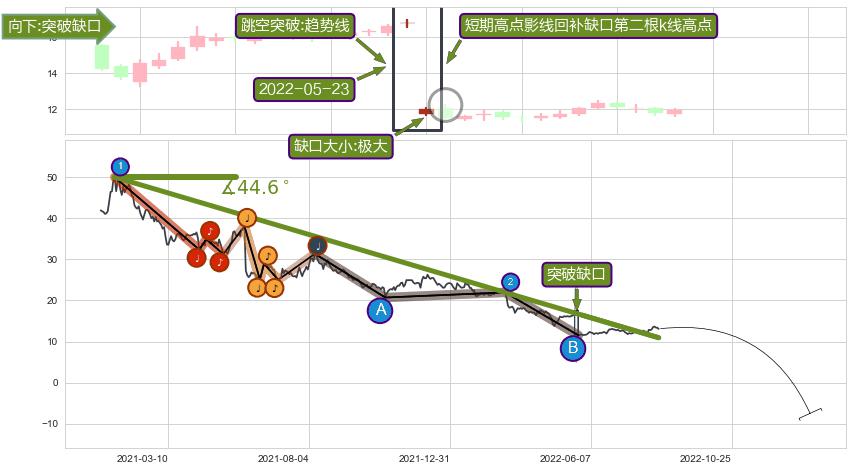 从2021-01-08至2022-05-27,共包含333个交易日,阶段股价下跌-123.33%,阶段股价变动位移路程比: 1 : 6,下跌趋势角度: 44.6,2021-06-01向↘︎形成缺口,跳空下跌-28.52%˚