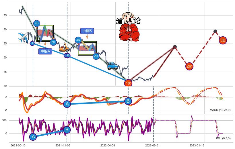 ➣ 【中枢B】:2021-12-02-2022-01-28,中枢由5笔构成,共41交易日, ZG=24.59, ZD=23.10