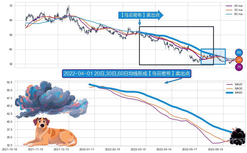⚀ 2022-01-05日-2022-06-28日显现 20日-30日-60日均线 【乌云密布】卖出点 看空信号,后市看跌,卖出