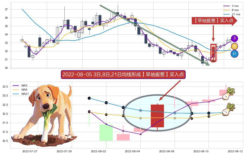 ⚀ 2022-08-05日显现 3日-8日-21日均线 【旱地拔葱】买入点 看多信号,后市看涨,买入