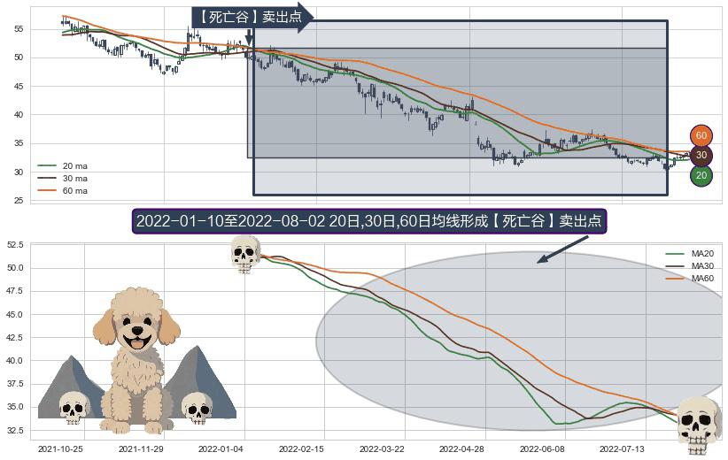 ⚀ 2022-01-11-日至2022-08-02-日显现 20日-30日-60日均线 【死亡谷】卖出点 看空信号,后市看跌,卖出