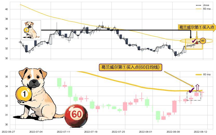 ⚀ 2022-08-11-日显现 葛兰威尔均线 60日均线 第买①入点 走势反转见底信号,后市看涨,买进信号