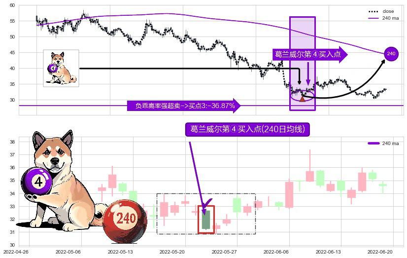 ⚀ 2022-05-24-日显现 葛兰威尔均线 240日均线 第④买入点 下降趋势均值回复的短线反弹信号,后市看涨,买进信号