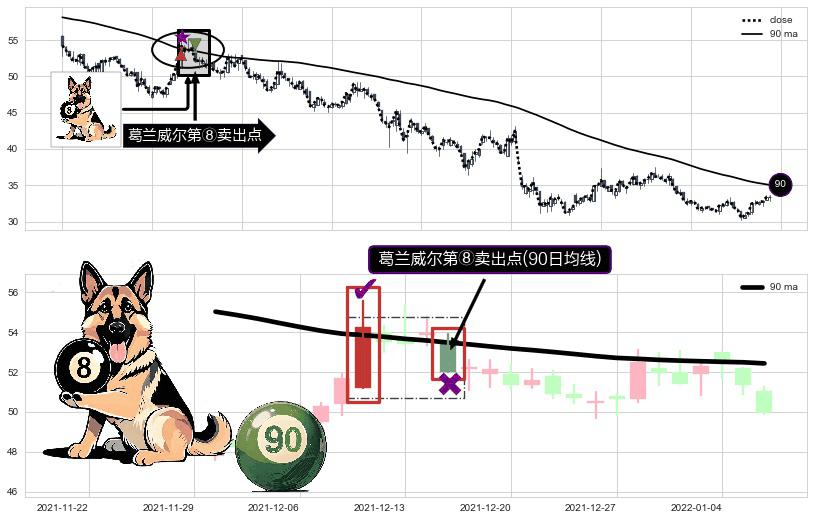 ⚀ 2021-12-15-日显现 葛兰威尔均线 90日均线 第⑧卖出点 下降趋势的中继信号,后市看跌,卖出信号