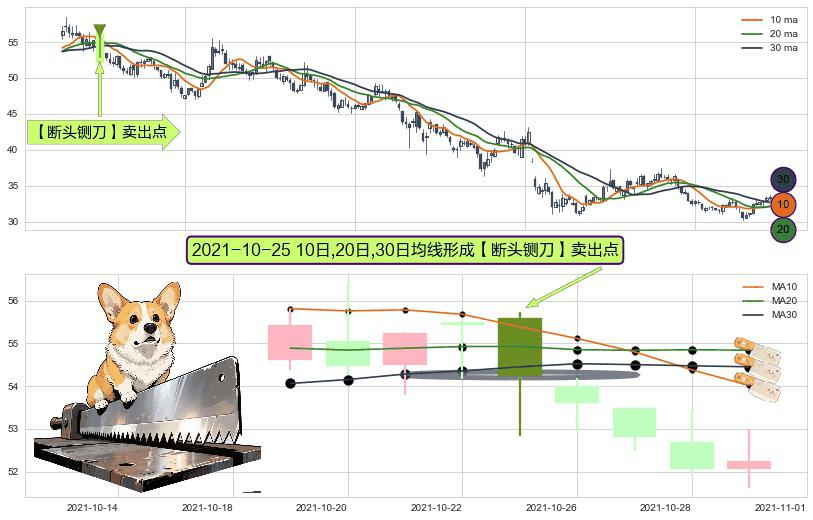 ⚀ 2021-10-25日显现 10日-20日-30日均线 【断头铡刀】卖出点 看空信号,后市看跌,卖出