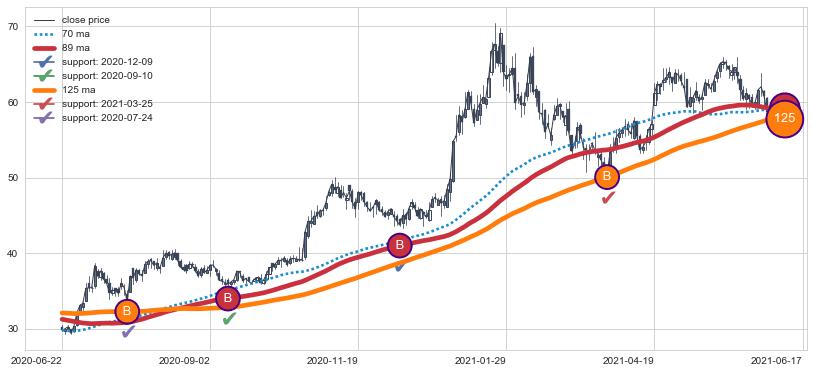 ⚀ 中期均线MA13上穿长期均线MA21形成的交叉是标准 黄金交叉