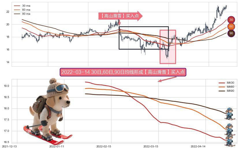形态多维评估: ⚀ 2022-01-24日-2022-04-27日显现 30日-60日-90日均线 【高山滑雪】买入点 看多信号,后市看涨,买入