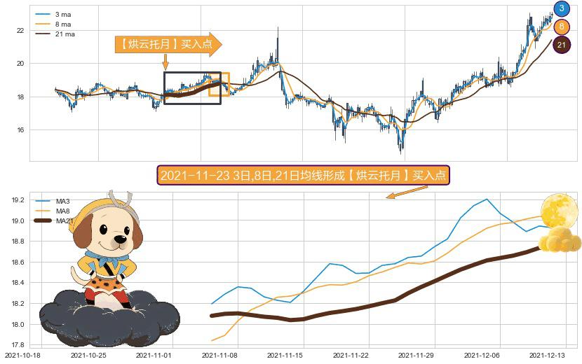 形态多维评估: ⚀ 2021-11-04日-2021-12-10日显现 3日-8日-21日均线 【烘云托月】买入点 看多信号,后市看涨,买入