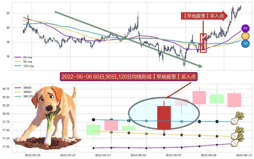 形态多维评估: ⚀ 2022-06-06日显现 60日-90日-120日均线 【旱地拔葱】买入点 看多信号,后市看涨,买入
