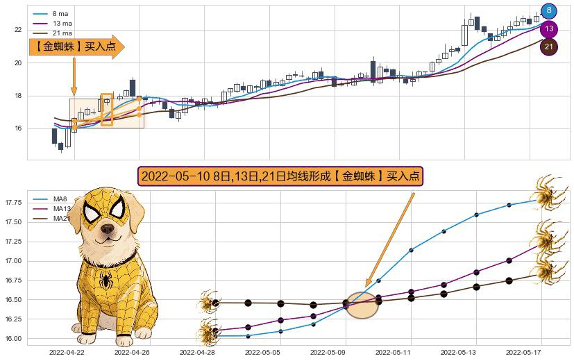 形态多维评估: ⚀ 2022-05-10日显现 8日-13日-21日均线 【金蜘蛛】买入点 看多信号,后市看涨,买入