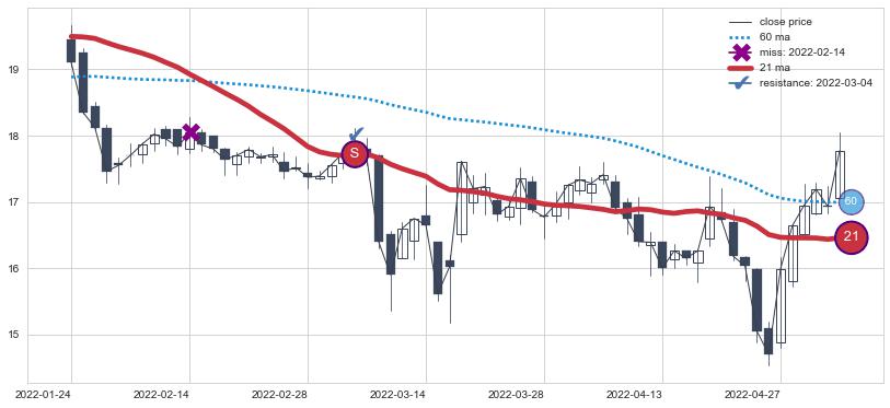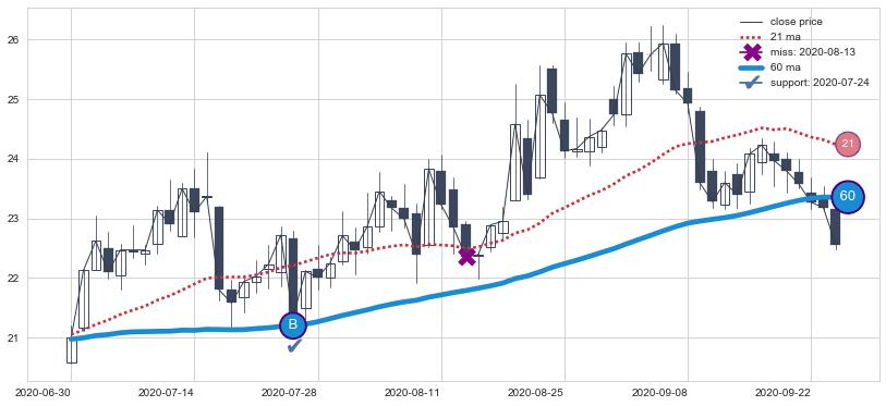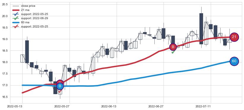 上涨趋势2022-05-13-2022-07-15,均线60, 21确认关键支撑2处
