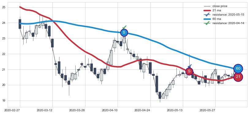 下跌趋势2020-02-27-2020-06-04,均线60, 21确认关键阻力2处