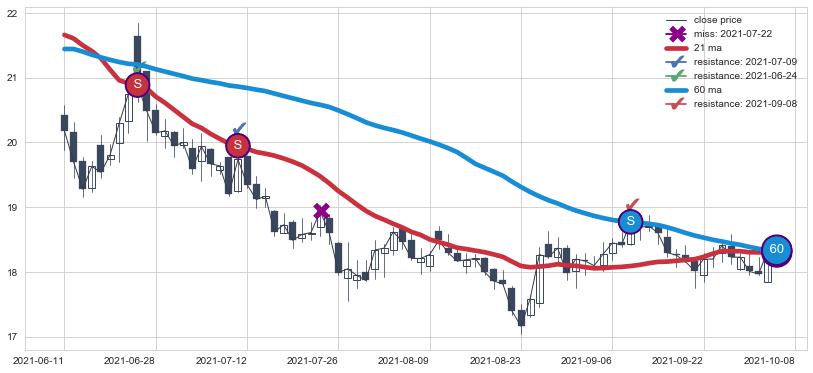 下跌趋势2021-06-11-2021-10-08,均线60, 21确认关键阻力3处