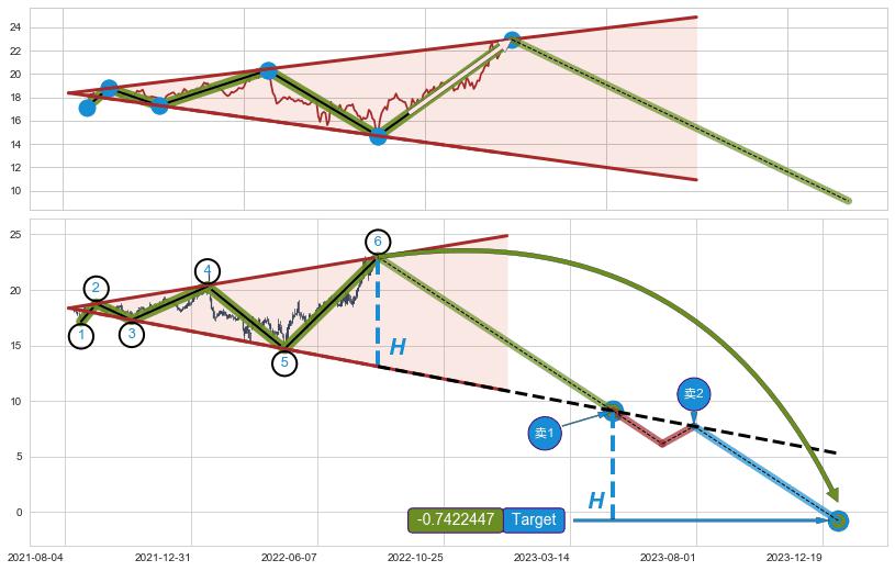 ➢ 最小反转跌幅→𝐇: 9.85 (逐步抬高阻力斜边最后的阻力点⑥与支撑边垂直距离)