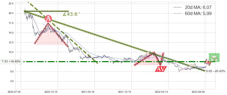 🦴 长线均值回复组合短线趋势跟踪[强阻力信号]2020-08-03-2022-06-28下跌趋势依然成立(下跌趋势跟踪依然存在),短线价格略微上行反弹(均值回复猜想),即将接近下跌趋势提供的未破位阻力价格:5.05。