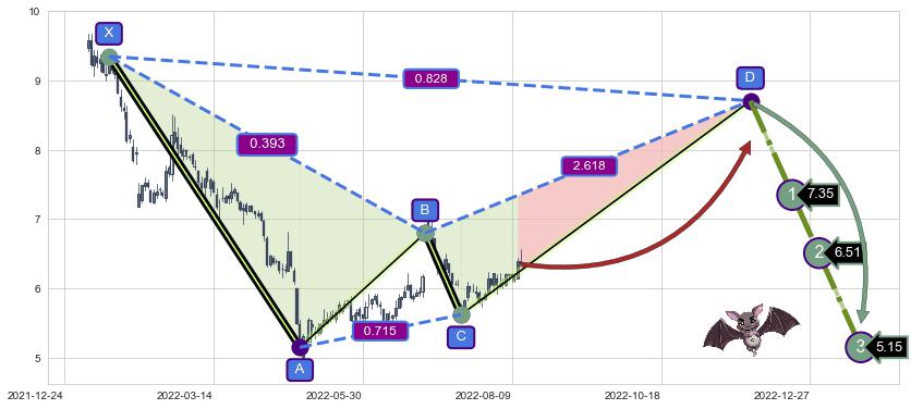 ➣ 未完成【蝙蝠】形态起点X: 2022-01-17, 已到达C点: 2022-07-15, 预测最终D点: 2022-11-29, 共215交易日