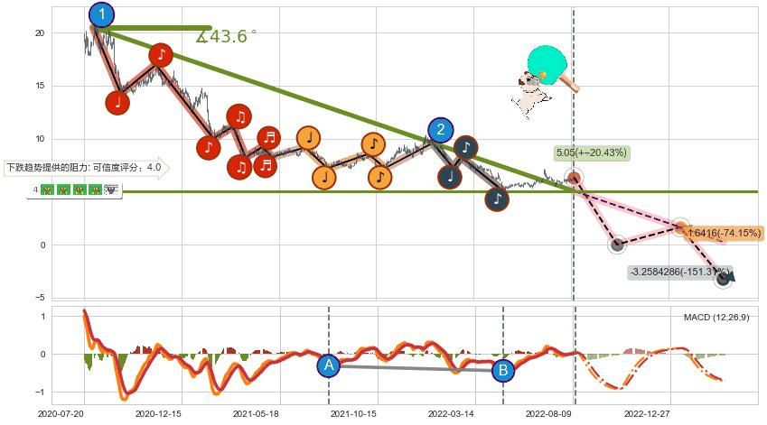 ♘ 在最后的下跌阶段2020-08-03至2022-06-28,存在 破位边缘的阻力位 ,阻力价格5.05,可信任强度82.21%,其距离最后价格6.35相差 -20.43%