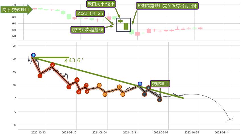 从2020-08-03至2022-06-28,共包含461个交易日,阶段股价下跌-105.09%,阶段股价变动位移路程比: 1 : 8,下跌趋势角度: 43.6