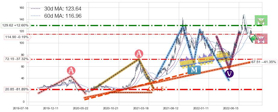 ♘ 阻力价格位129.62,可信任强度73.29%,距离最后交易2022-08-12形成的收盘价格115.11相差 +12.60%
