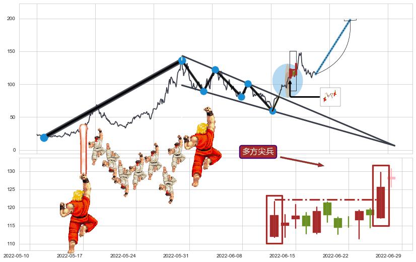 | 3 🅚:上升抵抗 ➕ 📐:降楔型向上突破击穿阻力位, 猜想持续拉升上涨,被突破的阻力位已变为支撑位 ☞ 看多信号 ⇥ 【🅚线】交织【图形】⇥ 综合量化分数: 56 | > |