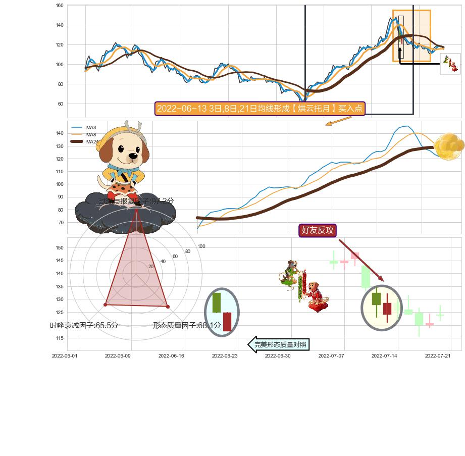 | 2 🅚:阳包阴(穿头破脚) ➕ 🎢:【烘云托月】买入点均线组合买入点信号形成后,猜想后续上升持续,上涨加速(趋势跟踪) ☞ 看多信号 ⇥ 【均线】交织【🅚线】⇥ 综合量化分数: 55 | > |