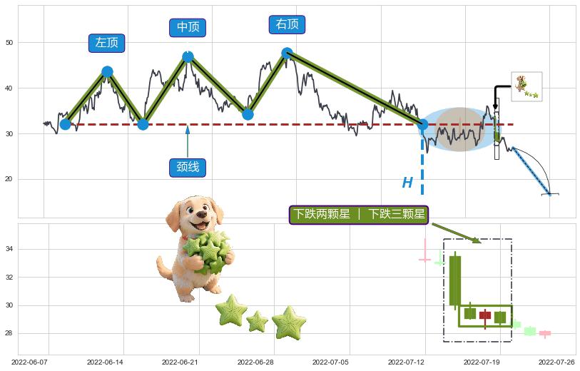 | 7 🅚:乌云盖顶 ➕ 📐:三重顶下行突破支撑位破位, 猜想持续下沉下跌,被突破的支撑位已变为阻力位 ☞ 看空信号 ⇥ 【🅚线】交织【图形】⇥ 综合量化分数: 45 | > |