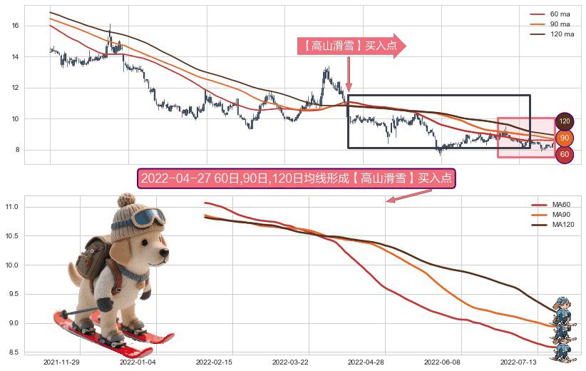 形态多维评估: ⚀ 2022-01-26日-2022-07-21日显现 60日-90日-120日均线 【高山滑雪】买入点 看多信号,后市看涨,买入
