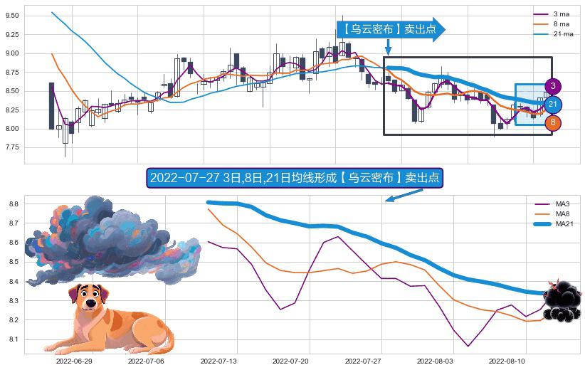 形态多维评估: ⚀ 2022-07-11日-2022-08-12日显现 3日-8日-21日均线 【乌云密布】卖出点 看空信号,后市看跌,卖出