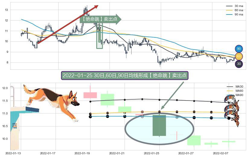 形态多维评估: ⚀ 2022-01-25日显现 30日-60日-90日均线 【绝命跳】卖出点 看空信号,后市看跌,卖出