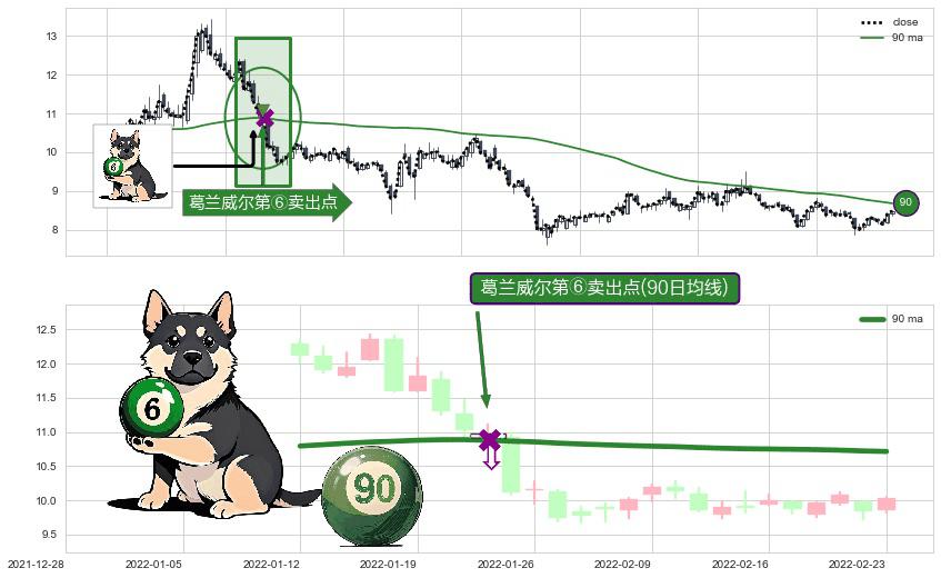 形态多维评估: ⚀ 2022-01-24-日显现 葛兰威尔均线 90日均线 第⑥卖出点 走势反转见顶信号,后市看跌,卖出信号