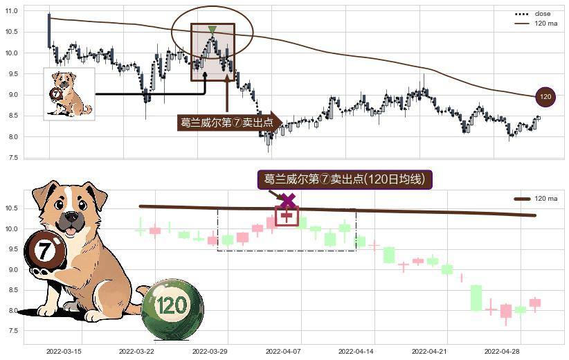 形态多维评估: ⚀ 2022-04-06-日显现 葛兰威尔均线 120日均线 第⑦卖出点 下降趋势的中继信号,后市看跌,卖出信号