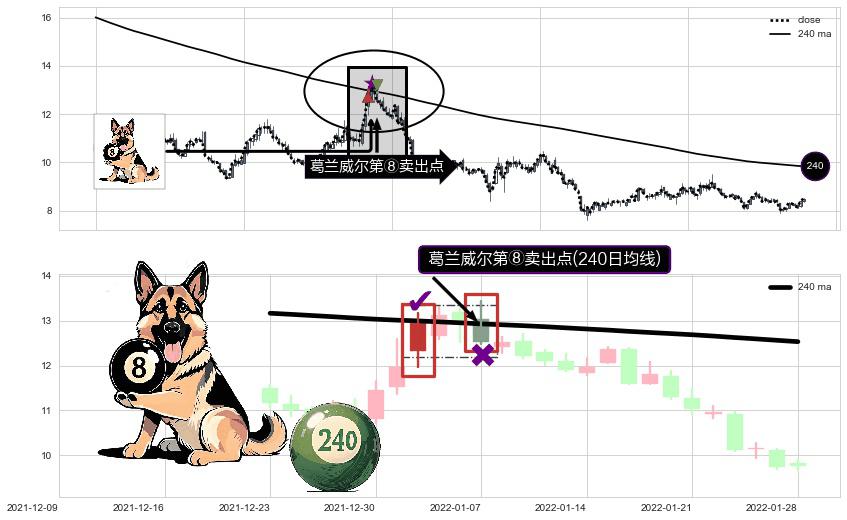 形态多维评估: ⚀ 2022-01-07-日显现 葛兰威尔均线 240日均线 第⑧卖出点 下降趋势的中继信号,后市看跌,卖出信号