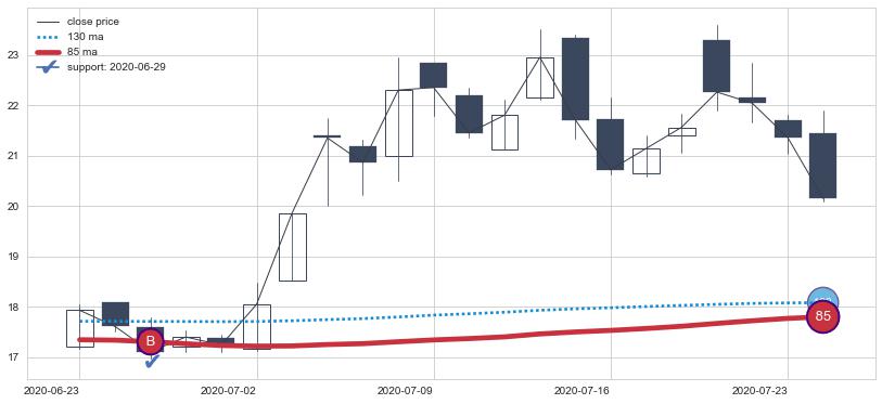 上涨趋势2020-06-23-2020-07-24,均线85确认关键支撑1处