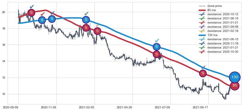 下跌趋势2022-03-30-2022-05-18,均线130, 85确认关键阻力1处