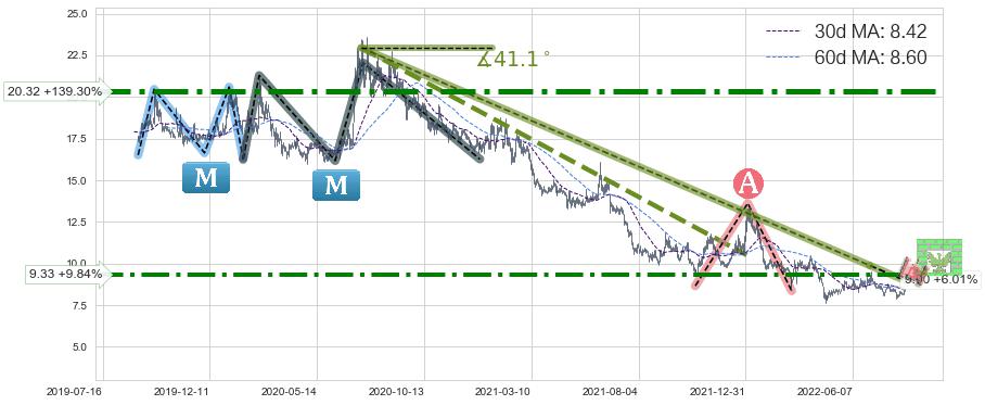 🦴 长线均值回复组合短线趋势跟踪[强阻力信号]2020-07-14-2022-06-29下跌趋势依然成立(下跌趋势跟踪依然存在),短线价格略微上行反弹(均值回复猜想),即将接近下跌趋势提供的未破位阻力价格:9.00。