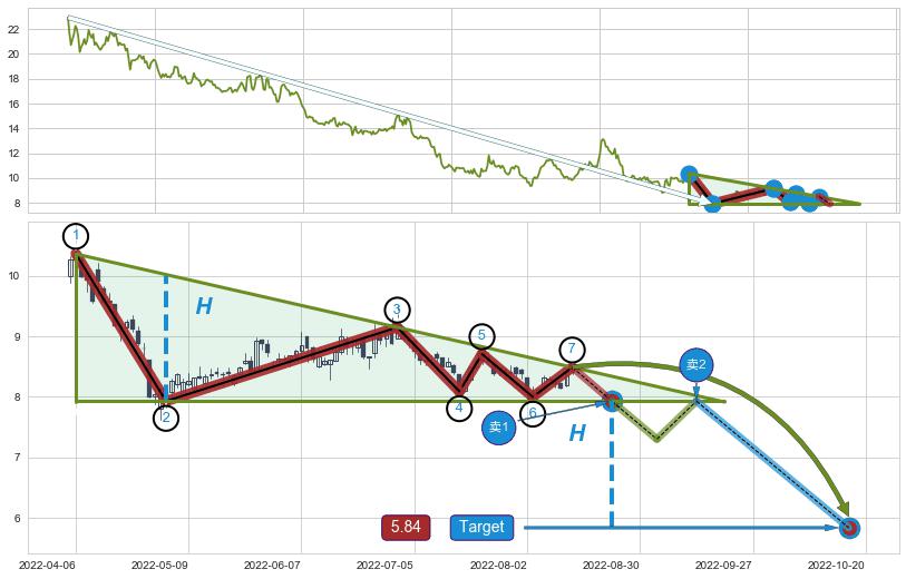 ➣ 【未确认突破,预测即将形成突破】下降三角形整理起点:2022-04-06, 预测突破点:2022-08-23,形态共96交易日