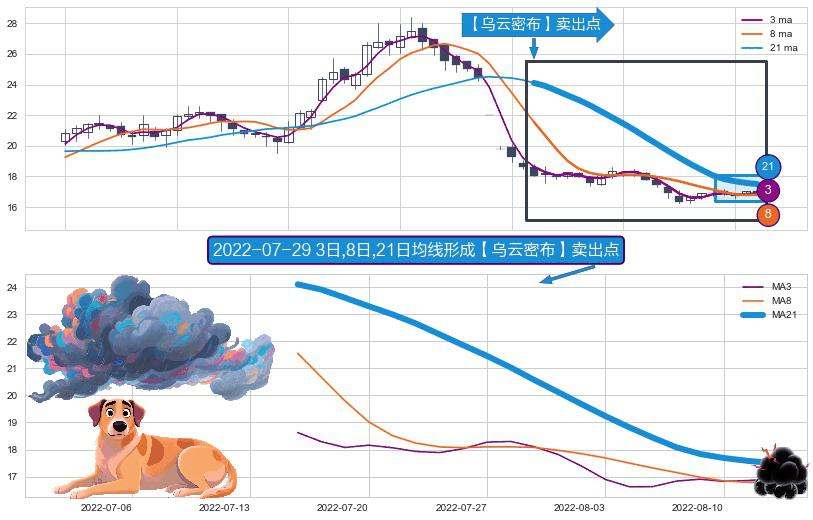 ⚀ 2022-07-15日-2022-08-12日显现 3日-8日-21日均线 【乌云密布】卖出点 看空信号,后市看跌,卖出