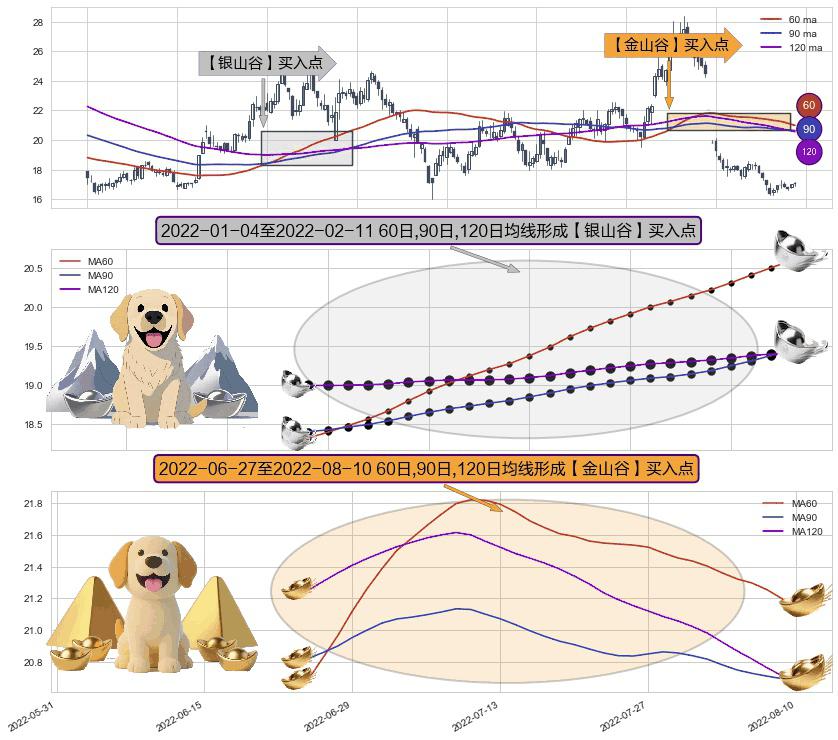 ⚀ 2022-06-28-日至2022-08-10-日显现 60日-90日-120日均线 【金山谷】买入点 其再次确认了买入信号,可靠性更强,买入
