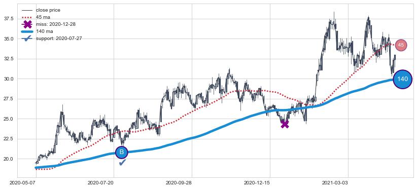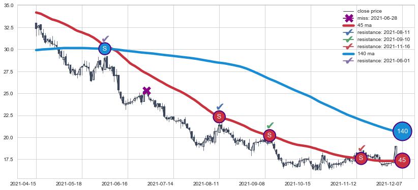 ⚁ MA3和MA8走势平行,且始终保持在短距离内,MA21始终在短中期均线上方,与短中期均线保持一定的距离,微微下行