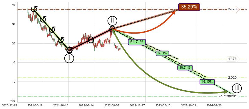 ➣ 调整浪已超过预测的c点位置,后续大趋势循环浪继续下跌概率64.71%,谨慎做多