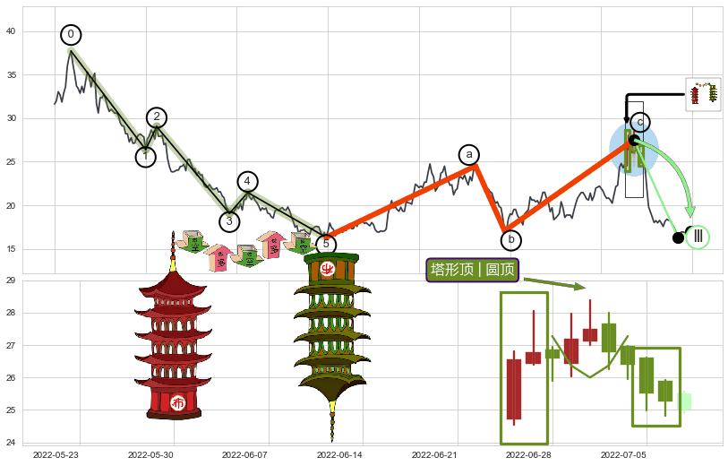 | 7 🅚:下跌两颗星 | 下跌三颗星 ➕ 🌊:波浪理论下跌5浪延续:猜想C点强阻力小反弹终止,猜想保持下跌5浪方向下行(均值回复后大周期继续趋势跟踪) ☞ 看空信号 ⇥ 【🅚线】交织【图形】⇥ 综合量化分数: 37 | > |
