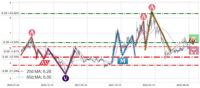 ♘ 阻力价格位6.38,可信任强度61.50%,距离最后交易2022-08-12形成的收盘价格6.19相差 +3.03%