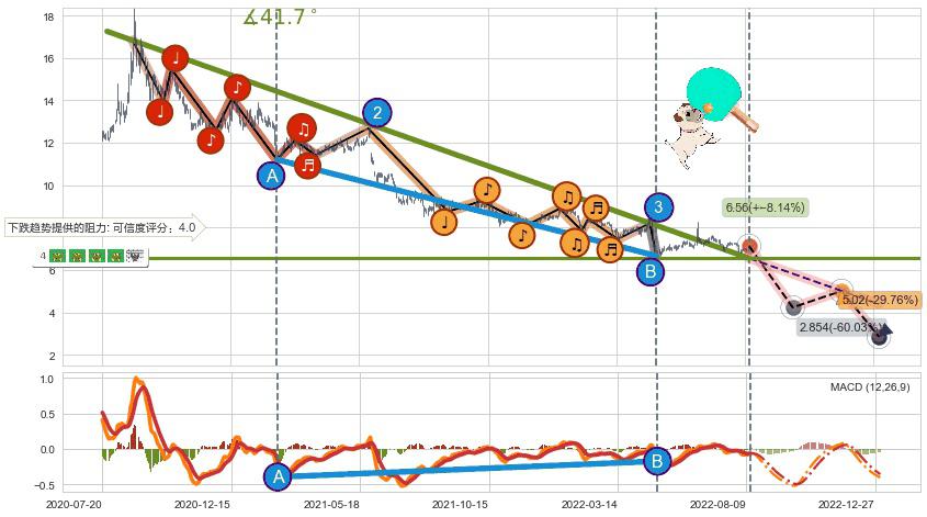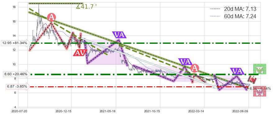 ♘ 在最后的下跌阶段2020-07-24至2022-07-01,存在 破位边缘的阻力位 ,阻力价格6.56,可信任强度82.32%,其距离最后价格7.14相差 -8.14%