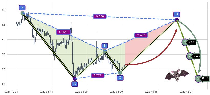 ➣ 未完成【蝙蝠】形态起点X: 2022-01-04, 已到达C点: 2022-08-03, 预测最终D点: 2022-11-24, 共222交易日