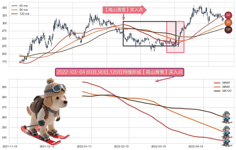 ⚀ 2022-01-04日-2022-04-29日显现 60日-90日-120日均线 【高山滑雪】买入点 看多信号,后市看涨,买入