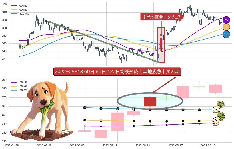 ⚀ 2022-05-13日显现 60日-90日-120日均线 【旱地拔葱】买入点 看多信号,后市看涨,买入