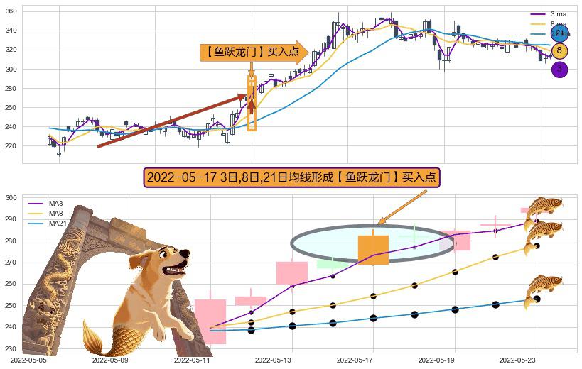 ⚀ 2022-05-17日显现 3日-8日-21日均线 【鱼跃龙门】买入点 看多信号,后市看涨,买入