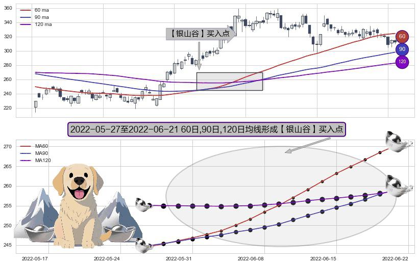 ⚀ 2022-05-30-日至2022-06-21-日显现 60日-90日-120日均线 【银山谷】买入点 看多信号,后市看涨,买入