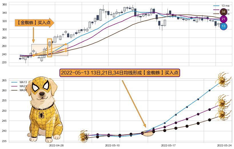 ⚀ 2022-05-13日显现 13日-21日-34日均线 【金蜘蛛】买入点 看多信号,后市看涨,买入